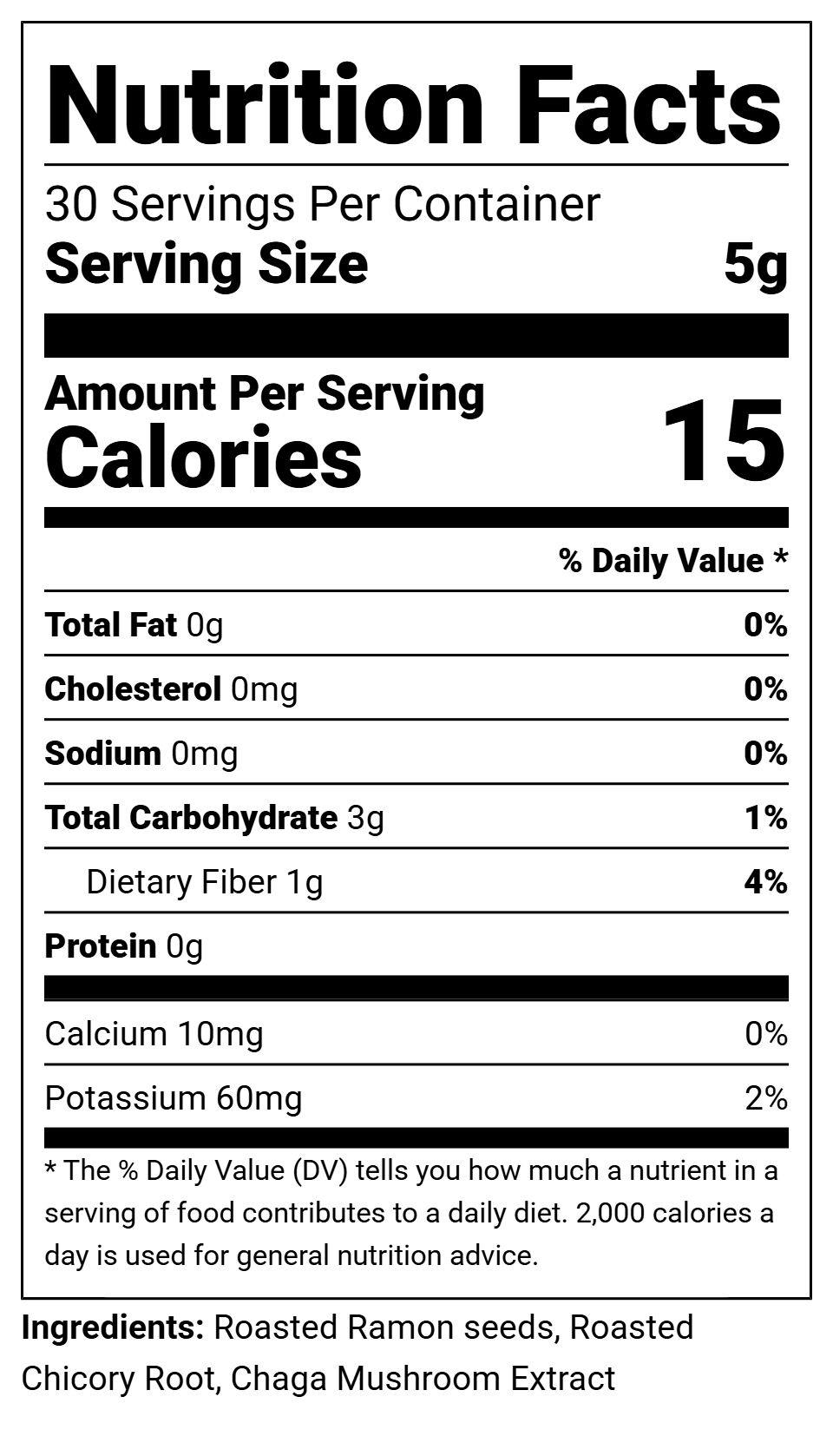 Ingredients: Organic Ramon, Organic chicory, Wildcrafted Chaga mushroom