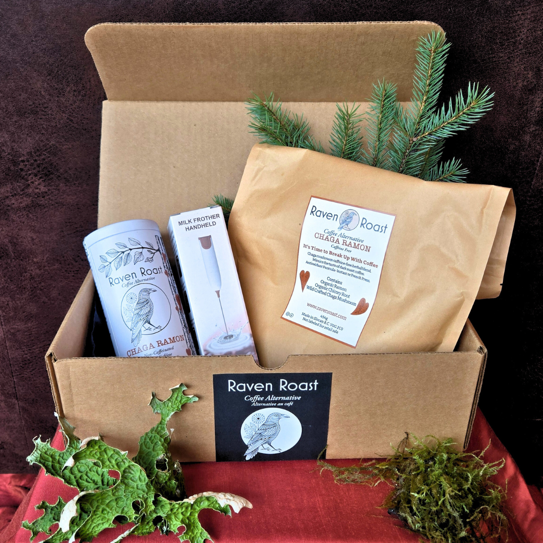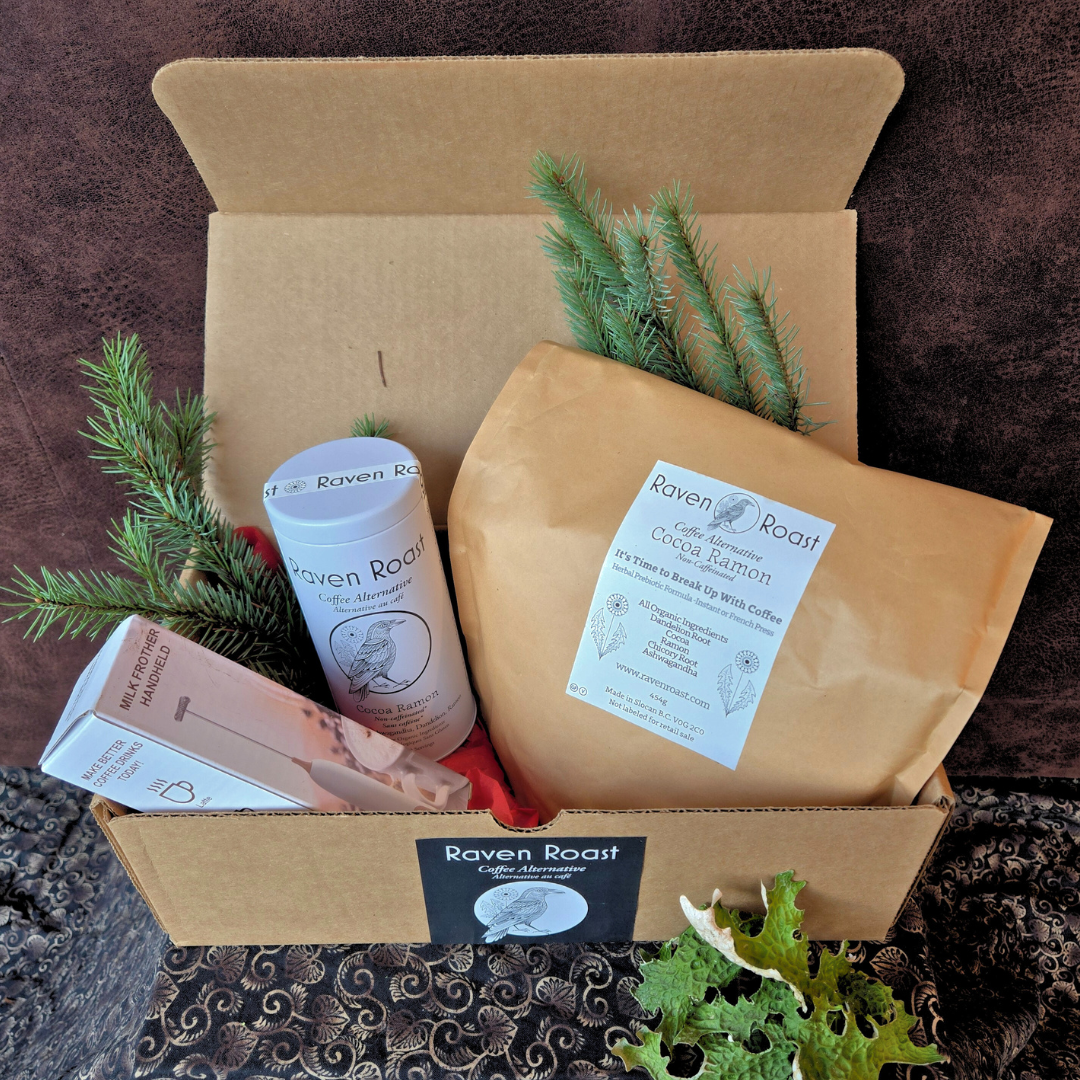 Raven Roast refill kits gift box. One of our attractive, durable re-fillable tins, with a full pound of bulk Raven Roast. Plus, make that a latte with a free milk frother!